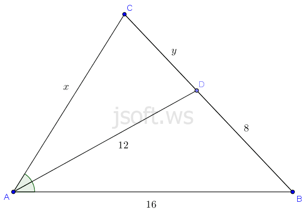 Məsələ 3: $ABC$ üçbucağının $AB$ oturacağı $16 cm$, $A$ bucağının $AD$ tənböləni $12 cm$, tənbölənin $BC$ tərəfindən ayırdığı $DB$ məsafəsi $8 cm$ olarsa üçbucağın tərəflərini tapın.