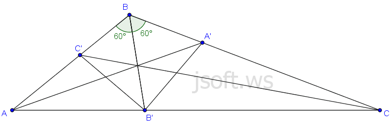 Məsələ 1: $\triangle ABC$-nin üç tənböləni çəkilib. Bu tənbölənləri uyğun olaraq $AA’$, $BB’$, $CC’$ işarə edək. $\angle B= 120°$ olarsa $\angle A’B’C’$-i tapın.