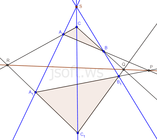 Əgər iki üçbucağın cüt-cüt təpə nöqtələrini birləşdirən düz xətlər bir nöqtədə kəsişərsə və ya bu düz xətlərin üçü də paralel olarsa, onsa bu üşbucaqların həmin təpələrə uyğun tərəflərinin uzantıları kəsişirsə, bu kəsişmə nöqtələri bir düz xətt üzərindədir.