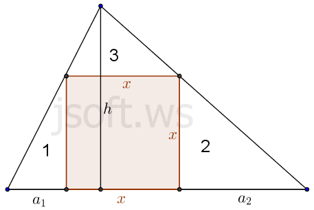 Əgər kvadratın tərəfi üçbucağın bir tərəfində yerləşib digər iki təpəsi üçbucağın digər tərəfləri üzərindədirsə bu kvadrat üçbucaq daxilinə çəkilmiş kvadrat adlanır. Üçbucaq daxilinə çəkilmiş kvadratın tərəfi bu üçbucağın oturacağı ilə hündürlüyü hasilinin, həmin oturacaq ilə həmin hündürlük cəminə nisbətinə bərabərdir.
