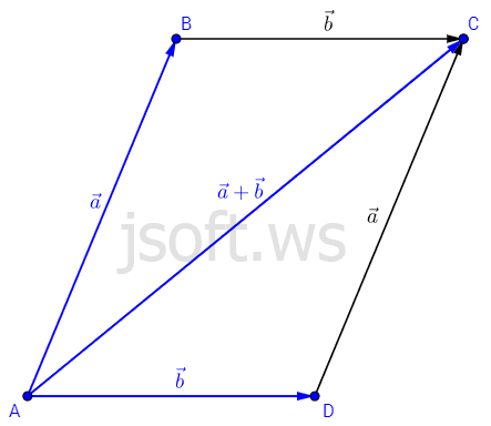 İki vektoru üçbucaq və paraleloqram qaydası ilə toplamaq olar. İstənilən a, b, və c vektoru üçün a+b=b+a kommutativlik və (a+b)+c=a+(b+c) assosiativlik qaydaları doğrudur.