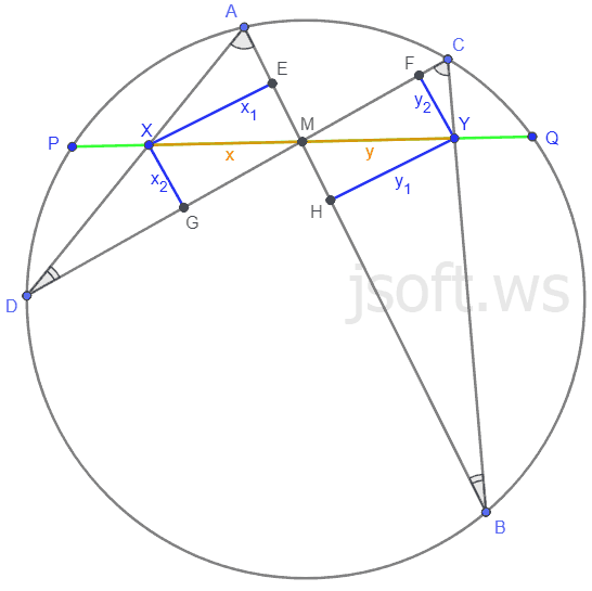 Tutaq ki, M nöqtəsi çevrənin PQ vətərinin orta nöqtəsidir. Həmin M nöqtəsindən iki AB və CD vətərləri çəkək. AD parçasının PQ vətərini kəsən nöqtəni X, BC parçasının PQ vətərini kəsən nöqtəni Y ilə işarə edək. Onda M nöqtəsi XY parçasının da orta nöqtəsi olacaq.